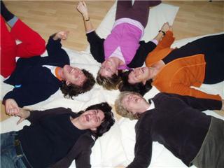 Op een lachyogabijeenkomst kan het gebeuren dat je zelfs op de grond ligt te schateren!